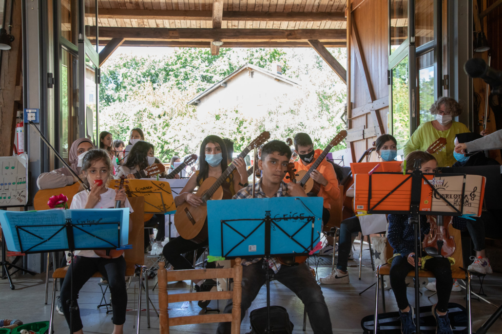 Die Kooperation mit MitMachMusik e.V. begann im Jahr 2020, als das Ensemble eher zufällig in Paretz landete. Inmitten der Corona-Pandemie suchte man einen großzügigen Raum für die Proben der Kinder. „In Paretz ist die Welt noch in Ordnung und die Kinder, die häufig Fluchterfahrungen gemacht haben, fanden dort eine Art Ersatz für die Sommerferien. Sie fühlten sich unbeschwert und frei, konnten Musik machen und endlich wieder gemeinsam üben“, erinnert sich Marie Kogge, Leiterin von MitMachMusik e.V. aus Potsdam, an diese besondere Zeit. Ein Höhepunkt dieses ersten Kapitels war das Konzert „Sommerklang“, das Anfang September in der Paretzer Scheune stattfand.
